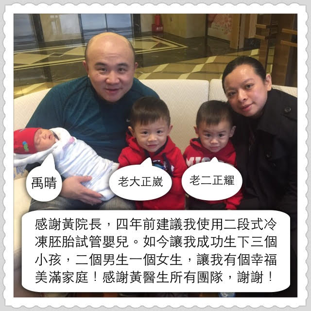 2011年6月友人介紹前往新光醫院黃建榮醫生那裡接受治療,因為我們已經5次人工受孕都未能成功,與黃醫師討論之後我們決定進行試管嬰兒的治療。9月完成取卵手術,經黃醫師的評估與建議,我們接受二階段試管嬰兒療法,意即取卵當月我們將全數胚胎冷凍,共取得四管凍胚。同年12月將第一管冷凍胚胎解凍後植入就懷孕,這是我們這十年來第一次懷孕,2012年8月順利產下第一個男寶寶,這中間太多的感動難以言喻,也總算是撥雲見日了。