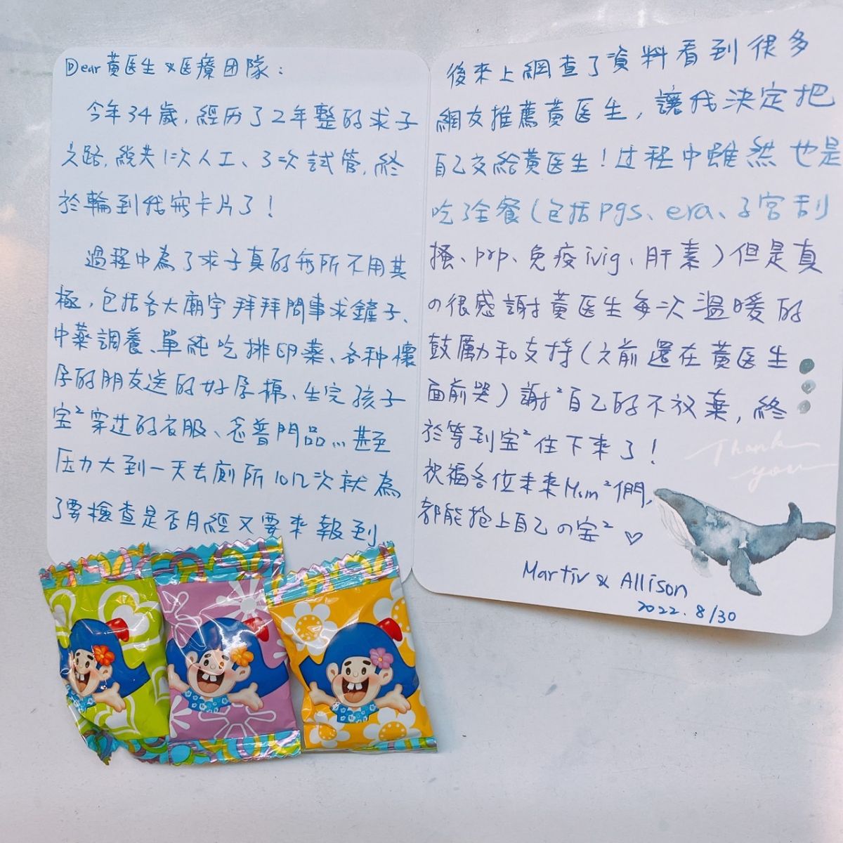 今年34歲,經歷了兩年整的求子之路,總共一次人工、三次試管,終於輪到我寫卡片了!