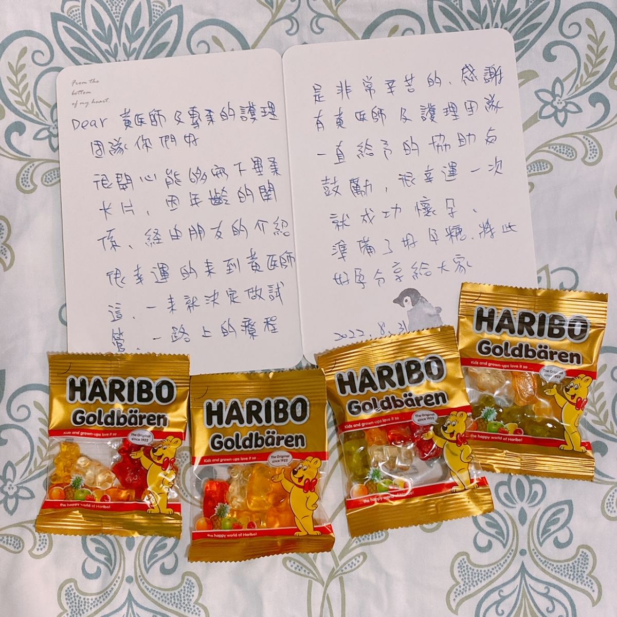 Dear 黃醫師及專業的護理團隊你們好: 很高興能夠寫下畢業卡片,因年齡的關係,經由朋友的介紹,很幸運地來到黃醫師這,一來就決定做試管,一路上的療程是非常辛苦的,感謝有黃醫師及護理團隊一直給予的協助與鼓勵,很幸運一次就成功懷孕,準備了好孕糖,將此好孕分享給大家2022.8.3