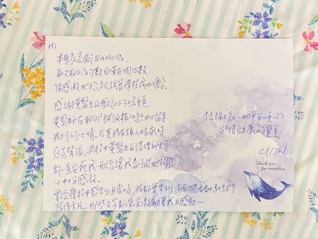 本身為高齡且AMH低,每次取卵的數目僅在個位數,很感激的一次試管療程成功懷孕。感謝黃醫師及團隊的照顧,黃醫師在取卵手術及植入時細心留意我們的心情,尤其我在植入漲尿時容易緊張,過程中黃醫師及護理師們都一直安撫我,配合讓我盡可能地放鬆心中十分感激,曾經療程中感到沮喪時,我都會來到這面牆看看媽媽們寫的卡片,那些文字都深深激勵著我且感動~