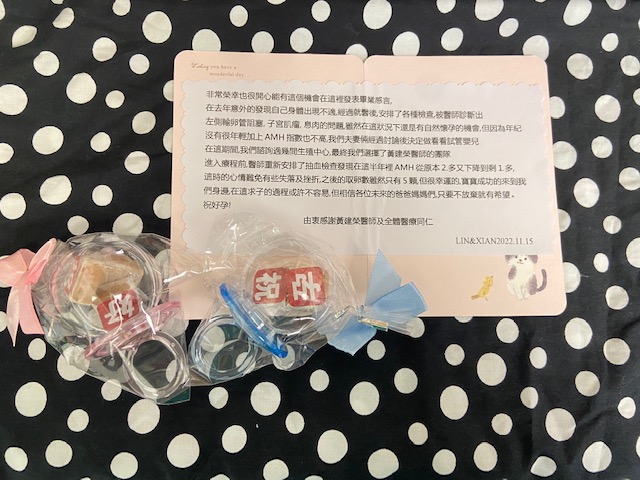 經過就醫後安排了各種檢查,被醫師診斷出左側輸卵管阻塞、子宮肌瘤、瘜肉的問題,雖然在這狀況下還是有自然懷孕的機會,但因為年紀沒有很年輕加上AMH指數也不高,我們夫妻倆經過討論後決定做看看試管嬰兒。