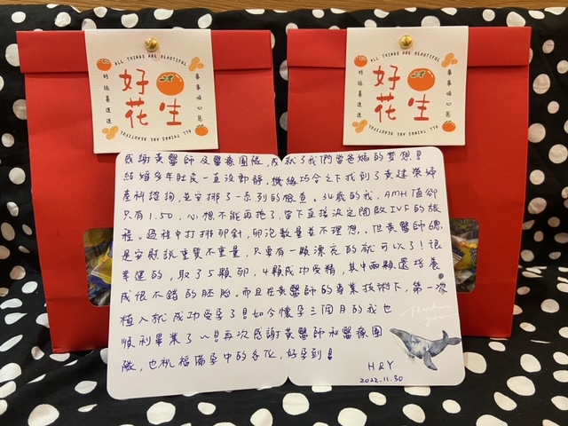 很幸運的取了5顆卵4顆成功受精中2顆還培養成不錯的胚胎,而且在黃醫師的專業技術下第一次植入就順利畢業了~如今懷孕三個月的我也順利畢業了!再次感謝黃醫師和醫療團隊也祝福備孕中的各位,好孕到!