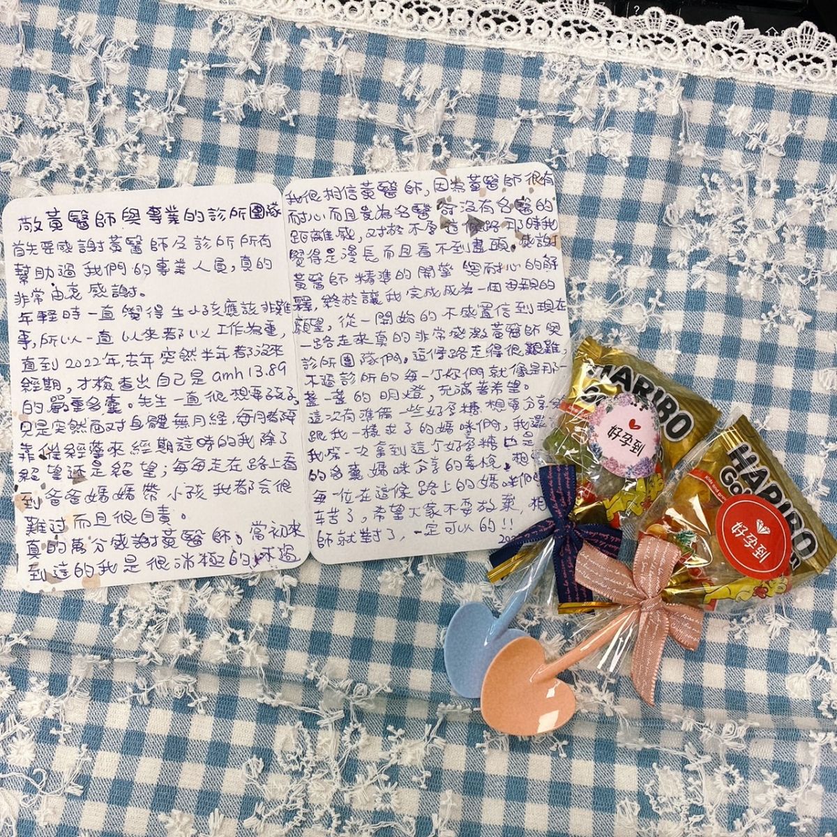 首先要感謝黃醫師及診所所有幫助過我們的專業人員,真的非常由衷感謝。年輕時一直覺得生小孩應該非難事,所以一直以來都以工作為重,直到2022年,去年突然半年都沒來經期,才檢查出自己是AMH13.89 的嚴重多囊。先生一直很想要孩子,只是突然面對身體無月經,每月都要靠催經藥來經期,這時的我除了絕望還是絕望;每每走在路上看到爸爸媽媽帶小孩我都會很難過而且很自責。