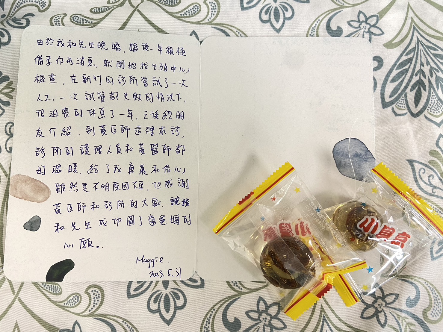 由於我和先生晚婚,婚後一年積極備仍無消息,就開始找生殖中心檢查,在新竹的診所嘗試了一次人工、一次試管都失敗的情況下,很沮喪地休息了一年,之後今朋友介紹到黃醫師這裡求診,診所的護理人員和黃醫師都好溫暖給了我勇氣和信心,雖然是不明原因不孕但感謝黃醫師和診所的大家,讓我和先生成功圓了當爸媽的心願。