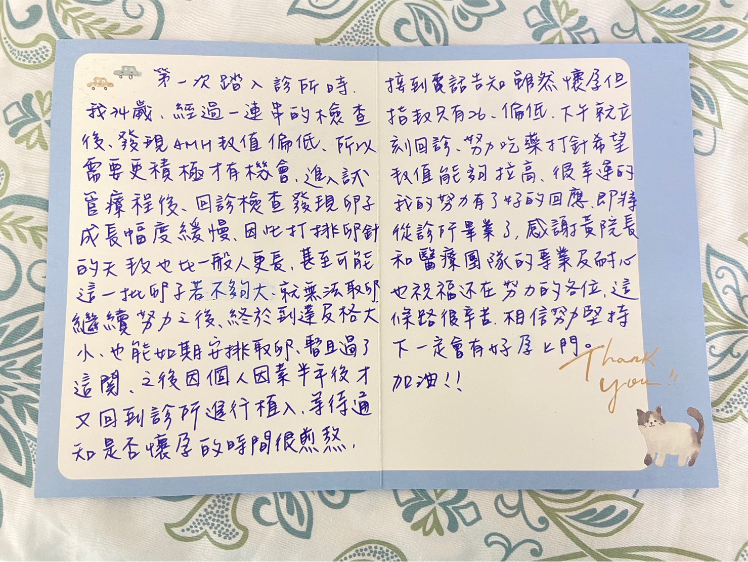 之後因個人素半年後才又回到診所進行植入,等待通知是否懷孕的時間很煎熬,接到電話告知雖然懷孕但指數只有26 偏低,下午就立刻回診努力吃藥打針,希望數值能夠拉高,很幸運地我的努力有了好的回應,即將從診所畢業了,感謝黃院長和醫療團隊的專業及耐心,也祝福還在努力的各位這條路很辛苦,相信努力堅持下一定會有好運上門。加油!!