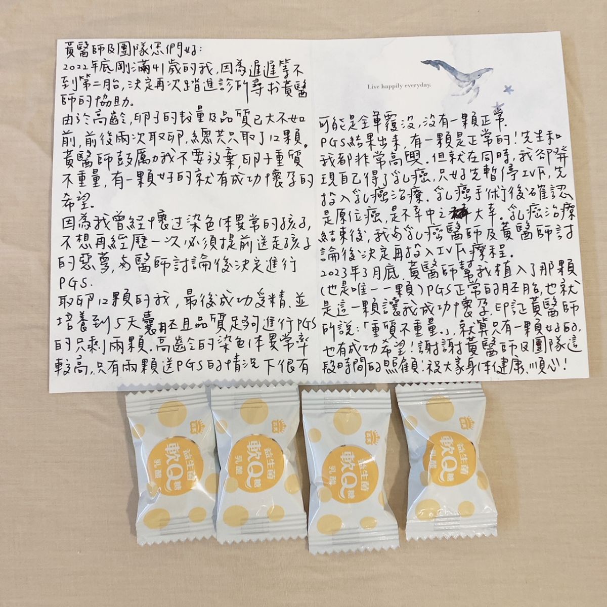 2023年3月底,黃醫師幫我植入了那顆 (也是唯一一顆)PGS正常的胚胎,也就是這一顆讓我成功懷孕,印証黃醫師所說:「重質不重量。」就算只有一顆好的,也有成功希望!謝謝黃醫師及團隊這 段時間的照顧:祝大家身体健康、順心!