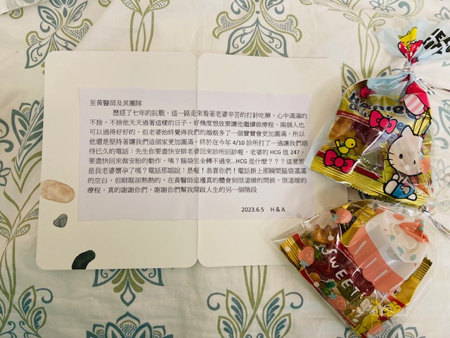 歷經了七年的抗戰,這一路走來看著老婆辛苦的打針吃藥,心中滿滿的不捨,不捨他天天過著這樣的日子,好幾度想放棄讓他繼續做療程,兩個人也可以過得好好的,但老婆始終覺得我們的婚姻多了一個寶寶會更加圓满,所以他還是堅持著讓我們這個家更加圓滿,終於在今年 4/10診所打了一通讓我們期待已久的電話:先生你要盡快安排老婆回來診所回診喔,老婆的HCG值247,要盡快回來做安胎的動作。
