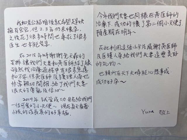 在此利用這張小卡片感謝黃醫師及護理人員,給我們夫妻這麼美好的禮物,也願所有天下夫妻能心想事成,成功受孕~