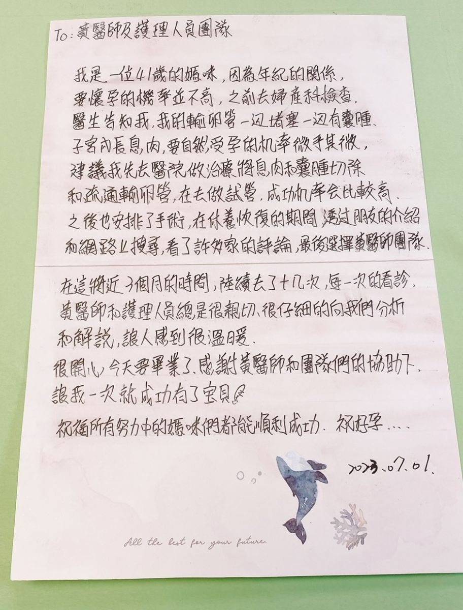 之後也安排了手術,在休養恢復的期間,透過朋友的介紹和網路上搜尋,看了許多家的評論,最後選擇黃醫師團隊,在這將近3個月的時間,陸續去了十幾次,每一次的看診,黃醫師和護理人員總是很親切,很仔細的向我們分析和解說,讓人感到很溫暖,很開心今天要畢業了,感謝黃醫師和團隊們的協助下,讓我一次就成功有了寶貝!