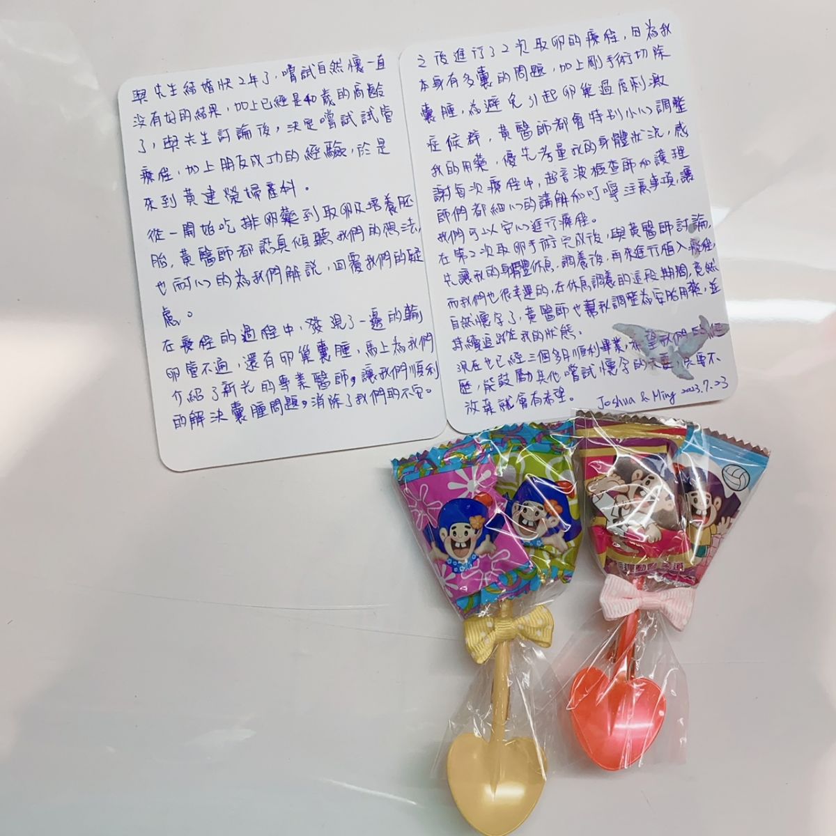 從一開始吃排卵藥到取卵及培養胚胎,黃醫師都認真傾聽我們的想法,也耐心的為我們解說,回覆我們的疑慮。