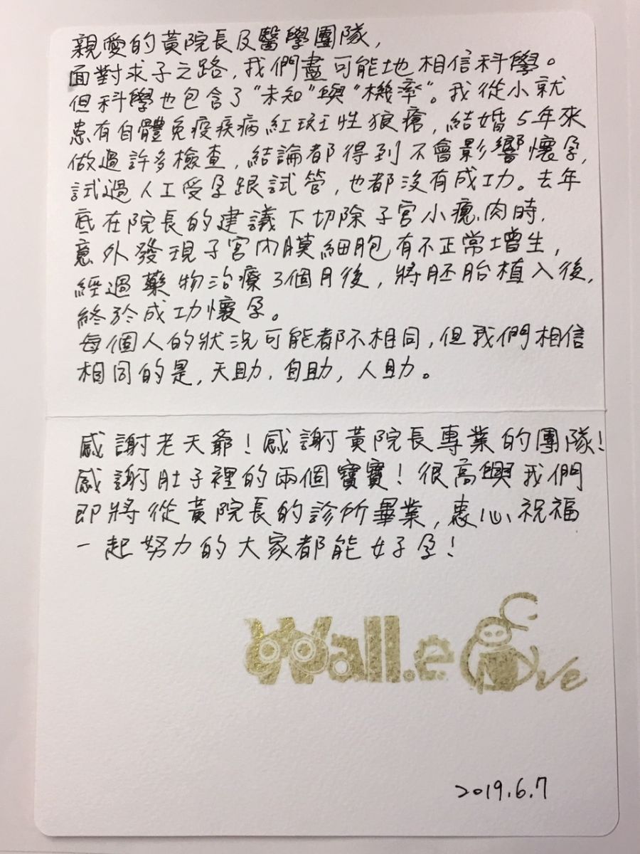 五年來做過許多檢查都正常卻遲遲不懷孕,但謝謝黃院長讓我帶著雙倍的幸福從本院畢業了,