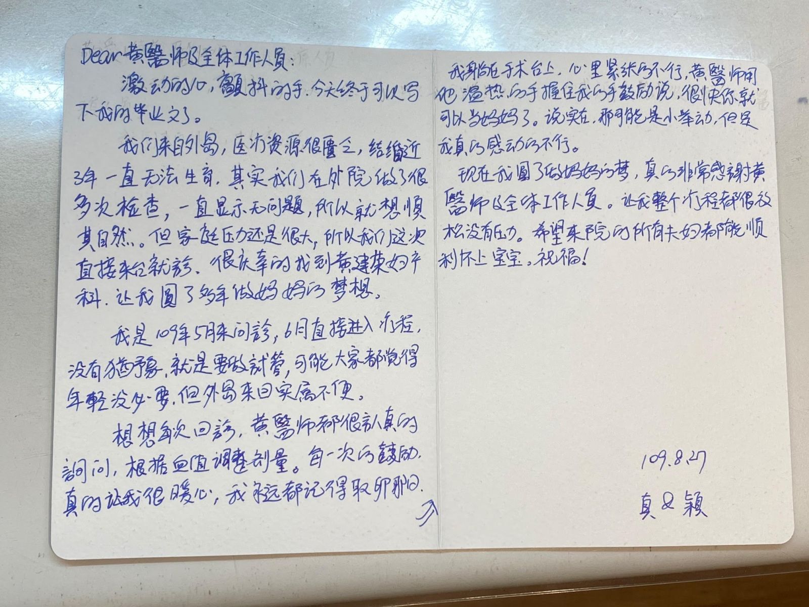 激動的心,顫抖的手,今天終於可以寫下我的畢業文了。我們來自外島,醫療資源很匱乏,結婚近三年一直無法生育,其實我們在外院做很多次檢查,一直顯示無問題,所以就想順其自然。但家庭壓力還是很大,所以我們這次直接來台就診,很慶幸的找到黃建榮婦產科,讓我圓了多年做媽媽的夢想。