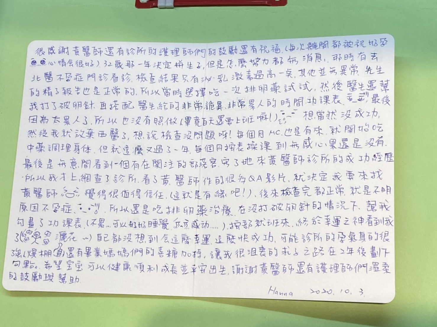 後來檢查完都正常,就是不明原因不孕症。所以還是吃排卵藥治療,在沒打破卵針的情況下,幫我勾畫了功課表,(不累…可以好好睡覺,感動…)按部就班來,終於幸運之神看到我了(灑花)自己都沒想到會這麼幸運,這麼快成功,可能診所的孕氣真的很強,爆棚,還有畢業媽媽們的喜糖加持,讓我很沮喪的求子之路在2年後劃下句點。希望寶寶可以健康順利成長並平安出生,謝謝黃醫師還有護理師們溫柔的鼓勵與幫助
