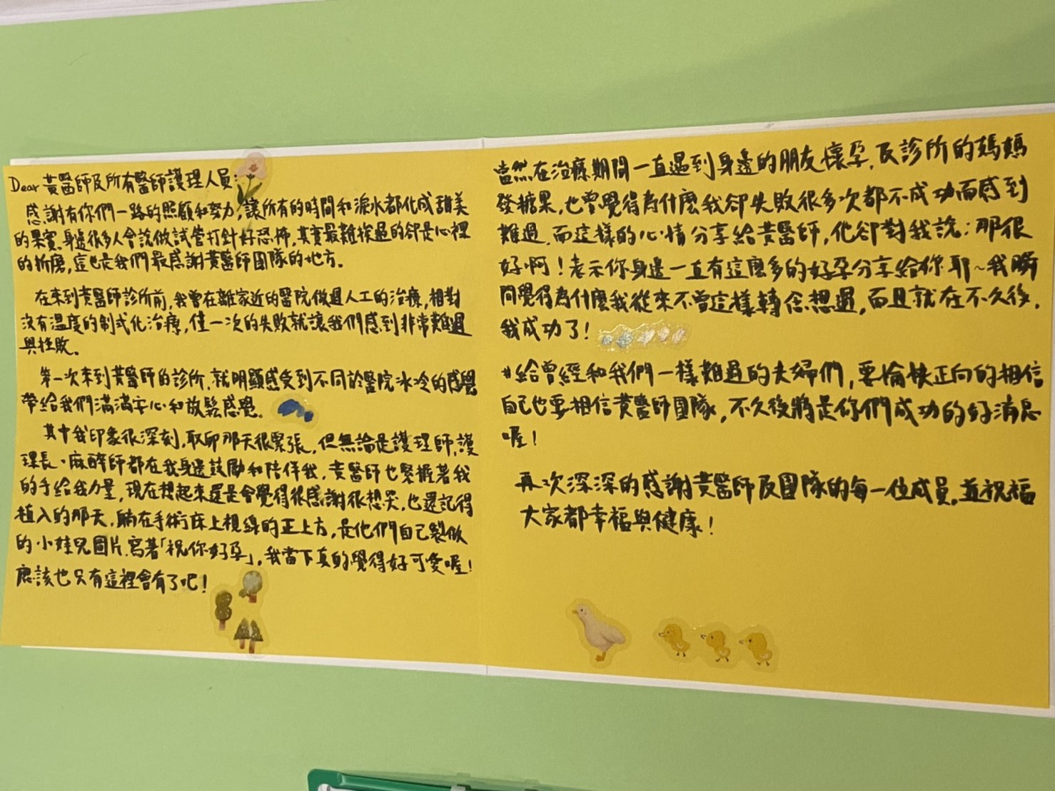 在來到黃醫師診所前,我曾在離家進的醫院做過人工治療,相對沒有溫度的制式化治療,僅一次的失敗就讓我們感到非常難過與挫折。第一次來到黃醫師的診所就明顯感受到不同於醫院冰冷的感覺,帶給我們滿滿的安心和放鬆感覺。