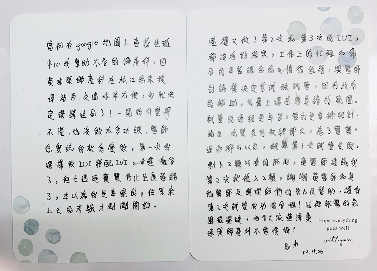 試管的過程更辛苦,要打更多排卵針、抽血、吃藥直到取卵那天,為了寶寶,這些都可以忍,雖然第1次試管失敗,剩下2顆冷凍的胚胎,黃醫師建議我 第2次就植入2顆,謝謝黃醫師和其他醫師及護理師們的努力及幫助,讓我第2次試管成功懷孕囉!這裡就醫的氛圍很溫暖,相信大家選擇黃建榮婦產科不會後悔!