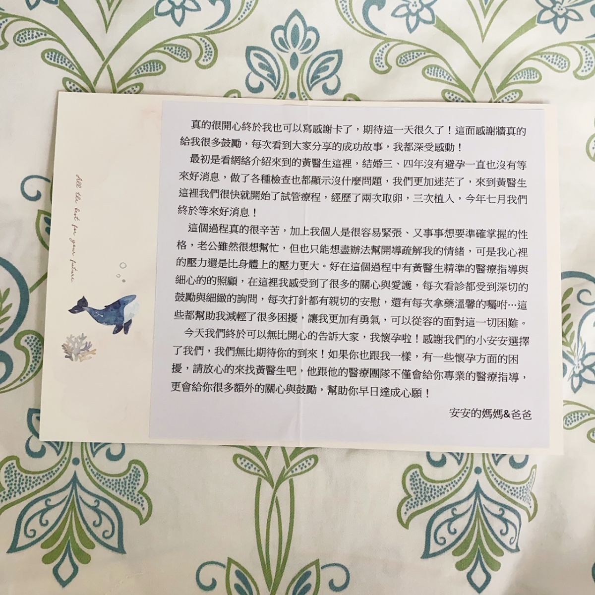 這位媽媽各項檢查都正常,經歷了兩次取卵,三次植入,現在滿三個月成功畢業了。