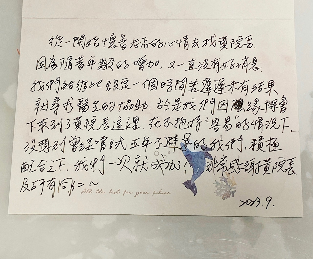 從一開始懷著忐忑的心情去找黄院長,因為隨著年齡的增加,又一直沒有好消息,我們給彼此設定一個時間若遲遲未有結果就尋求醫生的協助,於是我們因緣際會下來到了黄院長,在不抱持"容易"的情況下,沒想到曾經嚐試五年不避孕的我們,積極配合之下,我們一次就成功了!非常感謝黃院長及所有同仁~
