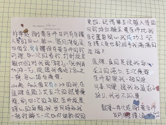 今年40歲,外院做試管沒有成功,因高齡擔心胚胎染色體異常,做試管嬰兒及胚胎切片,前前後後取了5次的卵,這次植入了一顆正常染色體胚胎成功懷孕,不放棄好孕很快就會來的!再次恭喜她,也祝福她未來孕產期一切順利。