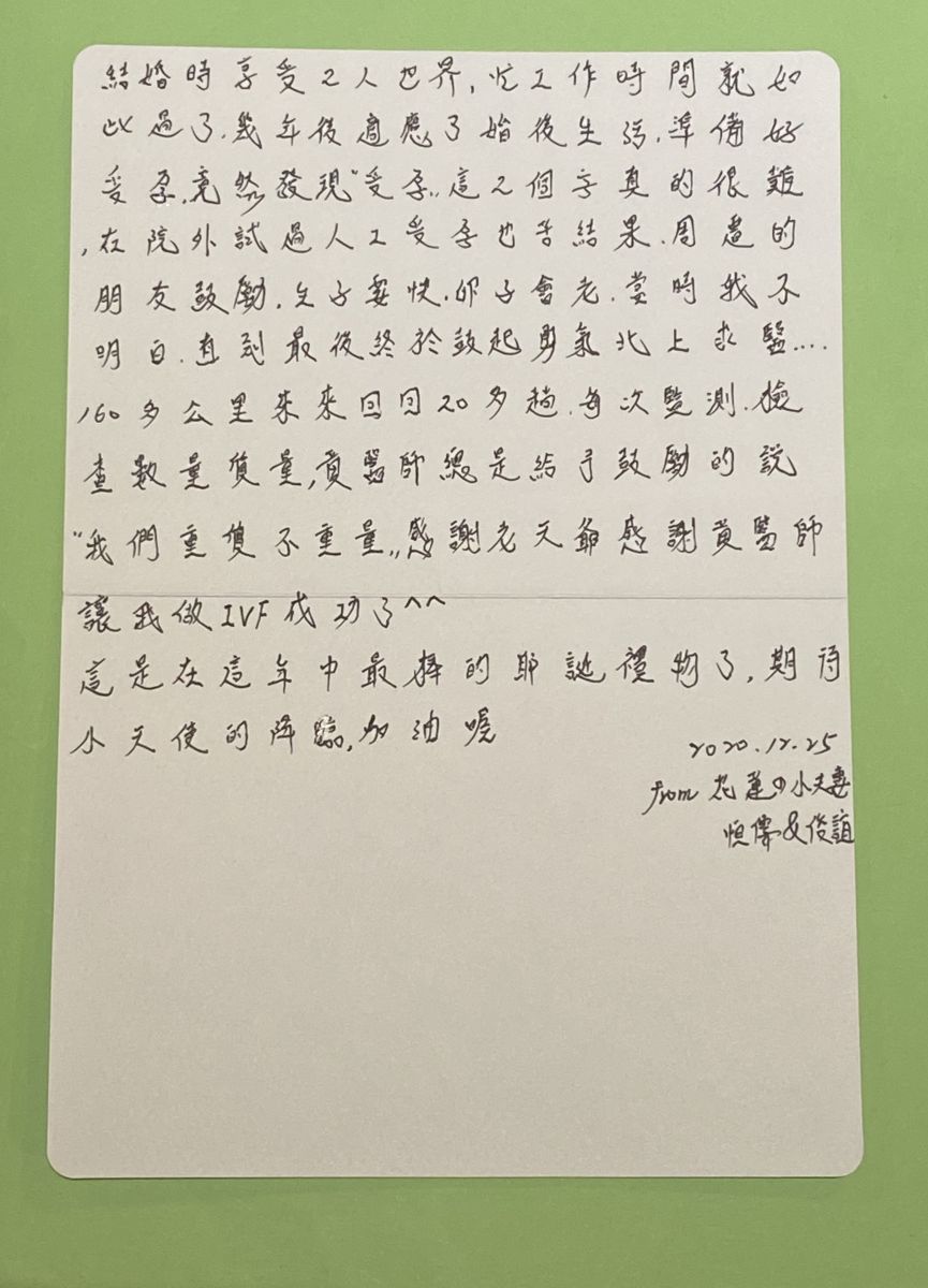 鼓起勇氣北上求醫…160多公里來來回回20多趟,黃醫師總是給予鼓勵的說”我們重質不重量”感謝老天爺感謝黃醫師讓我做IVF成功了。