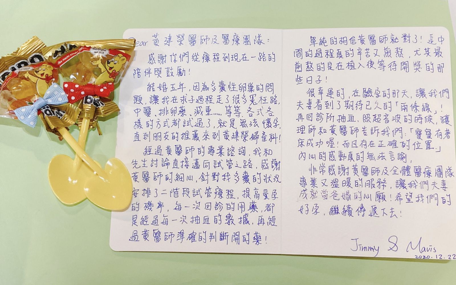 非常感謝黃醫師及全體醫療團隊專業又溫暖的服務,讓我們夫妻成就當爸媽的心願,希望我們的好孕,繼續傳遞下去!