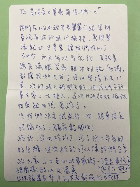 我們在108年經由長輩介紹來到黃院長診所進行療程,整個團隊親切又專業讓我們放心了不少,而且每次看完診黃院長總是滿臉笑容親切的說加油喔,都讓我們又有了信心堅持下去!第一次的之路雖然失敗但我們不放棄又第二次植入,這次HCG指數偏低後來就自然萎縮了。但我們決定試最後一次,跟黃院長討論P G S(因高齡的關係)