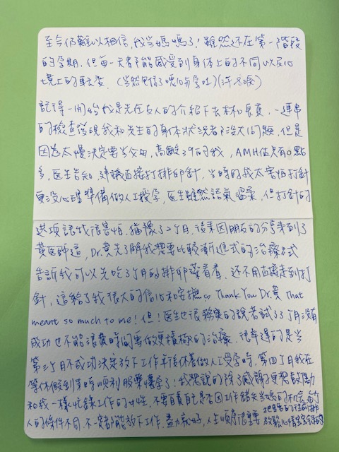 後來因朋友的分享來到了黃醫師這,Dr黃先了解我想要漸進式的治療方事,告訴我可以先吃3個月的排卵藥看看,還不用直接走到打針,這給了我很大的信心和安撫,thank you Dr.黃 that meant so much to me!但醫生也務實的說若試了三個月不成功也不能浪費時間要做更積極的人工受孕時,第四個月我在休假到來時順利服藥懷孕了,我想說的除了感謝更想鼓勵和我一樣忙碌工作的女性,不要自責自己是否因工做錯失當媽的機會,每個人的條件不同,不一定都能放下工作,盡力就好,人生的順序很重要,把重要的往前排,放鬆心情寶寶會來的。