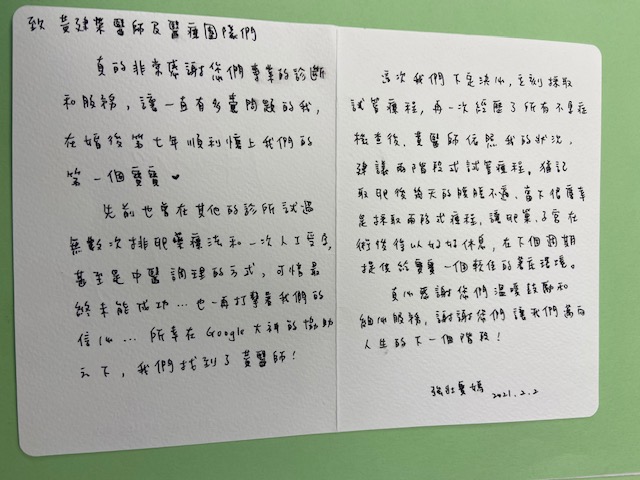 先前也曾在其他的診所試過無數次排卵藥療法和一次人工受孕,甚至是中醫調理的方式可惜最終未能成功…也一再打擊著我們的信心…所幸在Google大神的協助之下,我們找到了黃醫師!
