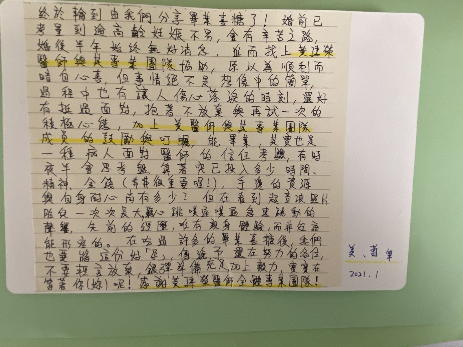 終於輪到由我們分享畢業喜糖了!婚前已考量到逾高齡妊娠不易,會有辛苦之路,婚後半年始終無好消息,進而找上黃建榮醫師與其專業團隊協助。原以為順利而暗自心喜,但事情絕不是想像中的簡單。過程中也有讓人傷心落淚的時刻,還好有挺過面對,抱著不放棄與再試一次的積極心態,加上黃醫師與其專業團隊的鼓勵與叮囑。能畢業其實也是ㄧ種病人面對醫師的信任考驗,有時夜半會思考盤算著究竟已投入多少時間、精神、金錢($$很重要喔!)手邊的資源與自身耐心尚有多少?但在看到超音波照片胎兒ㄧ次次長大、聽心跳噗通噗通急速跳動的聲響,先前的經歷唯有親身體驗,非短語能形容的。在吃過許多畢業喜糖後,我們也要將這份好「孕」,傳遞予還在努力的各位。不要輕言放棄,銀彈准備充足加上毅力,寶寶在等著妳(你)呢!感謝黃建榮醫師全體專業團隊!