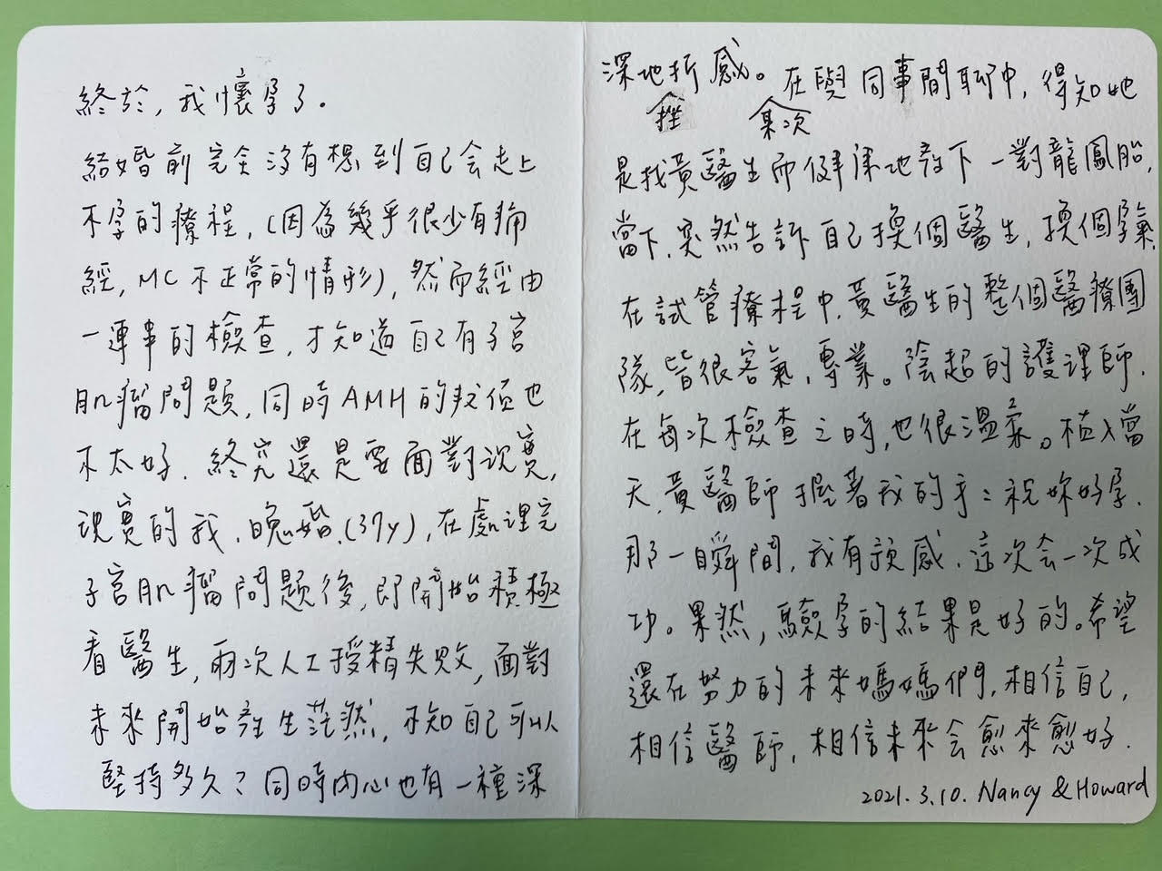 果然,驗孕的結果是好的。希望還在努力的未來媽媽們,相信自己,相信醫師,相信未來會愈來愈好