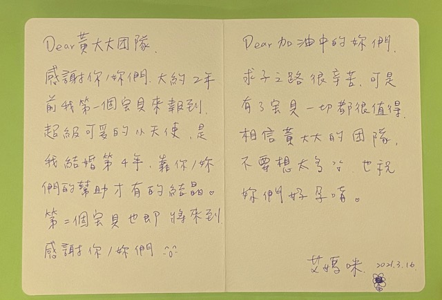 求子之路很辛苦,可是有了寶貝一切都很值得,相信黃大大的團隊,不要想太多,也祝妳們好孕呦。