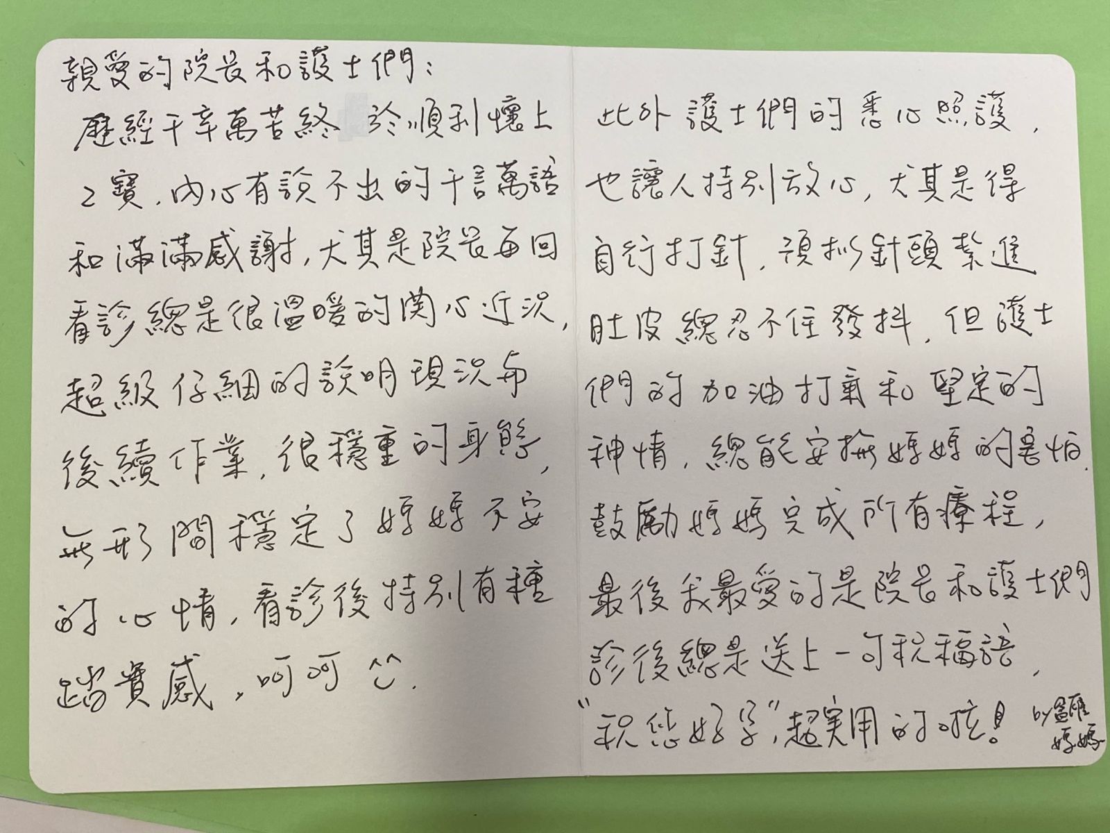 歷經千辛萬苦,終於順利懷上2寶,內心有說不出的千言萬語和滿滿感謝,尤其是院長每回看診總是很溫暖的關心近況,超級仔細的說明現況與後續作業,很穩重的身態,無形間穩定了媽媽不安的心情,看診後特別有種踏實感,呵呵^^