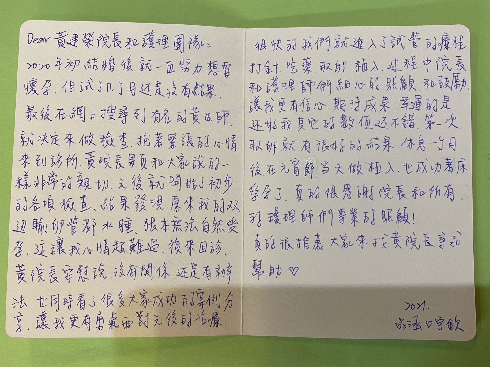 2020年初結婚後就一直努力想要懷孕,但試了幾個月還是沒有結果最後在網上搜尋到有名的黃醫師就決定來做檢查,抱著緊張的心情來到診所,黃院長果真和大家說的一樣非常親切,之後就開始了初步的各項檢查,結果發現原來我的雙邊輸卵管都水腫,根本無法自然受孕,這讓我心情超難過,後來回診,黃醫師安慰說"沒有關係,還是有辦法。"也同時看了很多大家成功的案例分享,讓我更有勇氣面對之後的治療。