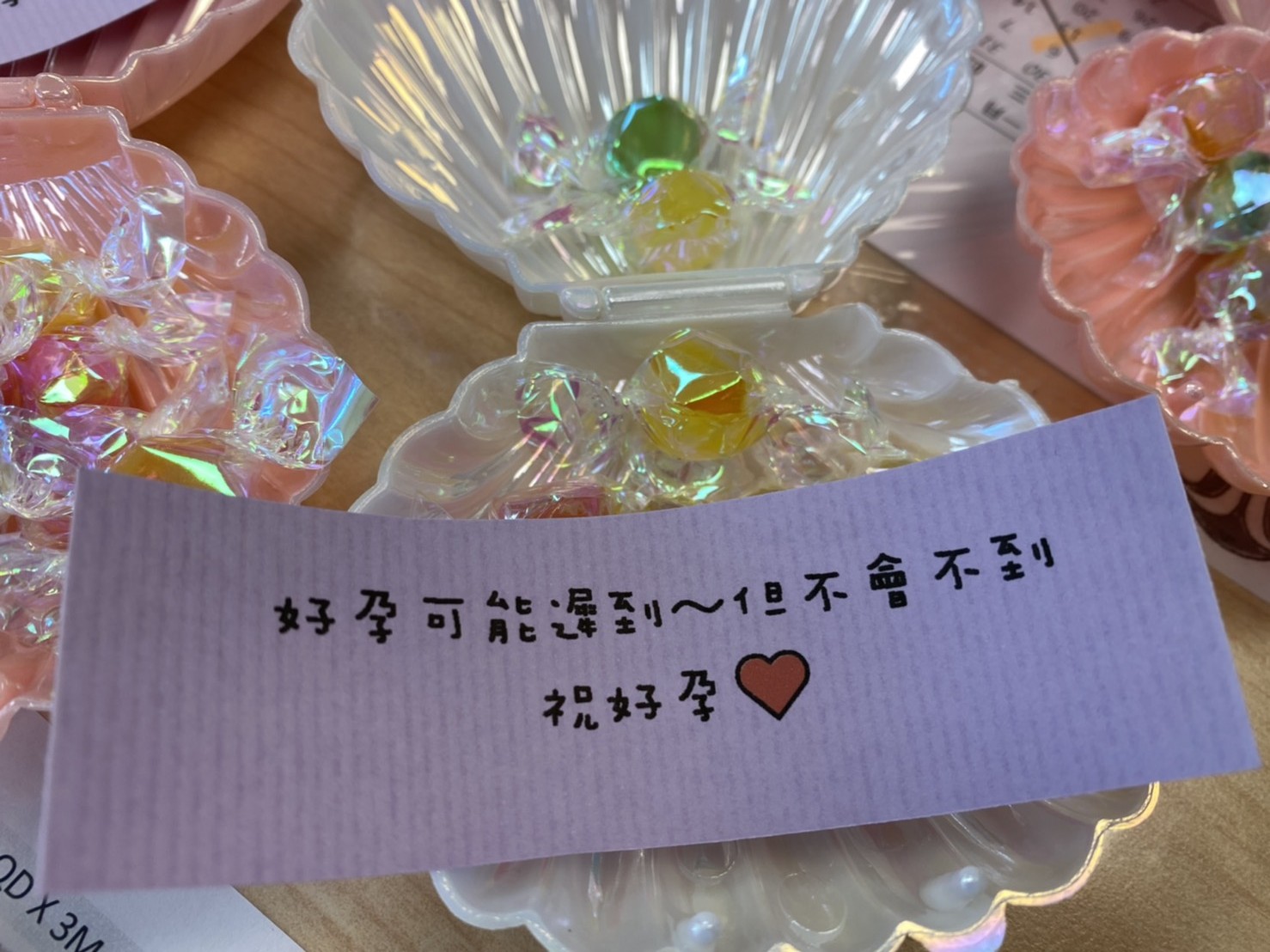 孕育珍珠的貝殼就好像媽媽孕育著寶寶,將這份在貝殼裡象徵新生命的好孕糖分享給大家,這位好朋友在外院曾經做過人工及試管的療程,就診時安排檢查後,才發現左側輸卵管阻塞且水腫,經討論後他們決定進入試管嬰兒的療程,試管嬰兒的療程若有輸卵管阻塞並不影響受孕,但若有輸卵管水腫,水腫的液體,會影響其著床的環境,且因為卵巢功能較為虛弱,建議先收集胚胎,待胚胎收集完後,在植入前安排了腹腔鏡的手術再進入解凍胚胎的療程,很幸運的第一次植入就順利懷孕,目前懷孕三個月畢業了,恭喜她,也祝福各位好朋友早日達成心願。