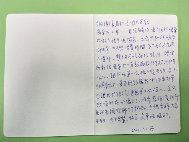 因為我和先生檢查都正常,也不想浪費時間,當下就決定進入療程,雖然在第一次植入後失敗,醫師鼓勵我們不要放棄也讓我們鼓起勇氣第二次植入。這次就順利成功懷上了!
