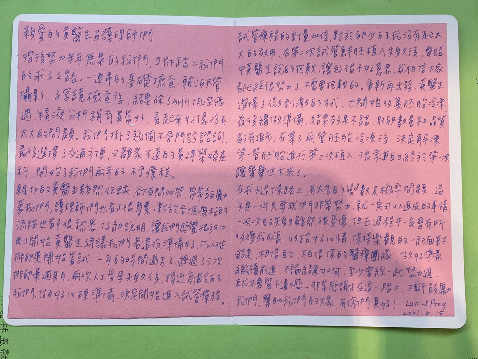 親切的黃醫師雖然忙碌,卻有問必答,常常鼓勵著我們,護理師們也都很專業,對於各種療程的流程也都很熟悉,仔細說明,讓我們感覺很放心,剛開始黃醫師建議我們若還沒有準備好,可以從排卵藥開始嘗試,一年的時間過去了,經過了三次排卵藥周期,兩次人工受孕失敗後,接近高齡的我們,做好心理準備,決定開始進入試管療程。