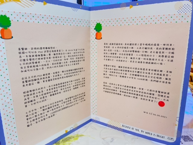 最後,我與老公要再次感謝黃醫師一從第一次遇到黃醫師就選擇相信他,不論是每次的看診或是取卵前後的關懷,您總是那磨温暖的鼓勵我,整個療程期間都讓我感到非常的安心。