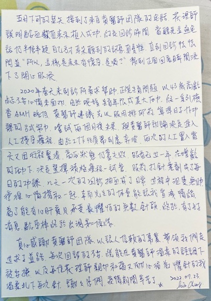 2020春天來到診所尋求幫助,正視生育問題,以43歲高齡忐忑不安心情來面對,由於晚婚生育年限成莫大壓力,經一系列檢查AMH略低,黃醫師建議先以服排卵藥,算準日子作功課的方式努力,嘗試兩個月後未果,與黃醫生討論決定進入人工受孕療程。由於工作性質需到處奔波,兩次的人工置入當天又因行程緊湊,高壓狀態仍舊失敗,眼看已過一年,在增齡的壓力下,決定選擇積極療程-試管。