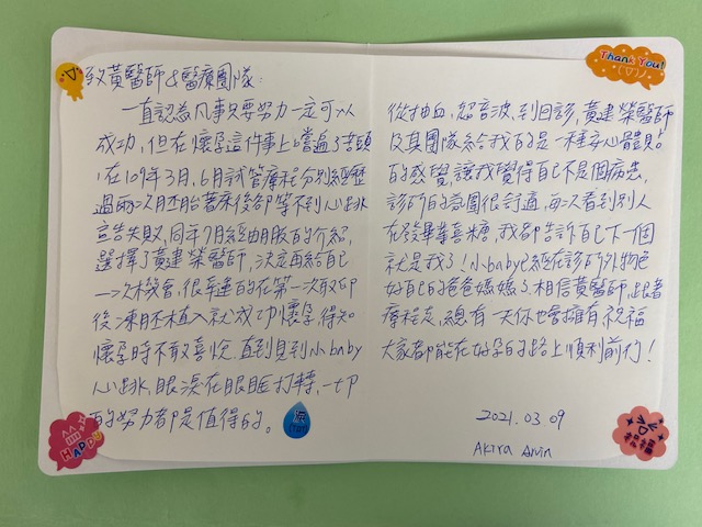 一直認為凡事只要努力一定可以成功,但在懷孕這件事上嚐遍了苦頭,在109年3月、6月試管療程分別經歷過兩次胚胎著床後卻等不到心跳宣告失敗,同年7月經由朋友的介紹選擇了黃建榮醫師決定再給自己一次機會。