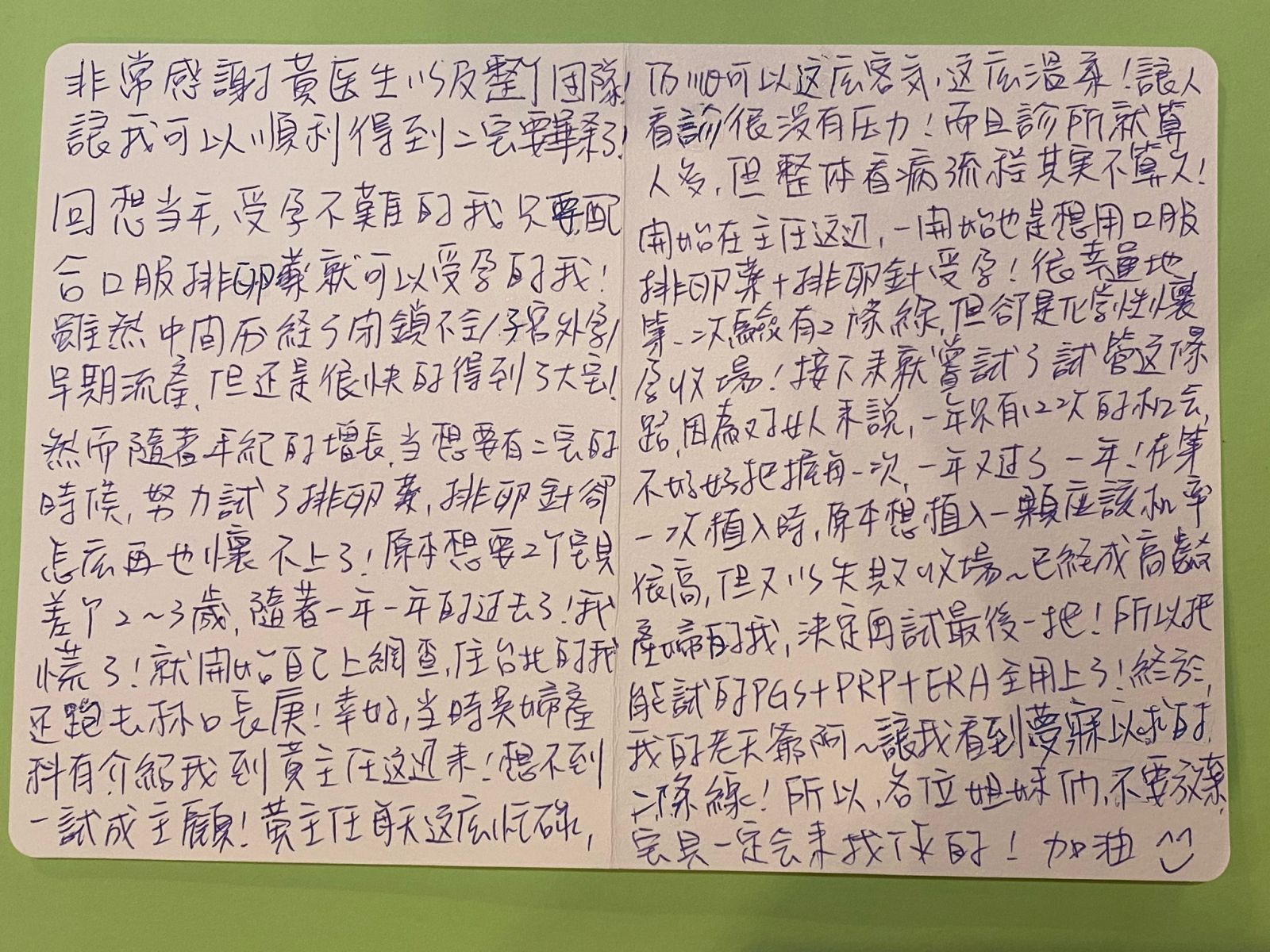 開始在主任這邊,一開始也是想用口服排卵藥+排卵針受孕!很幸運地第一次驗有兩條線,但卻是化學性的懷孕收場!接下來就嘗試的試管這不歸路!因為對女人來說,一年只有12次的機會,不好好把握每一次,一年又過了一年!在第一次植入時,原本想植入一顆應該機率很高,但又以失敗收場~已經成高齡產婦的我,決定再試最後一把!所以把能試的PGS+PRP+ERA全用上了!終於,我的老天爺啊~讓我看到夢寐以求的兩條線!所以,各位姐妹們,不要放棄,寶貝一定會來找你的!加油^^