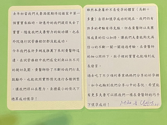 隨後我們夫妻努力的做功課,也在外院進行試管療程但都沒能成功。今年我們在許多網友推薦下來到黃醫師這邊,在試管療程中我們感受到與以往不同的親切氛圍,黃醫師除了不斷給我們打氣鼓勵外,也能依照實際情況進行各種調整,讓我們得以在壓力,負擔最小的情況下總算成功懷孕!