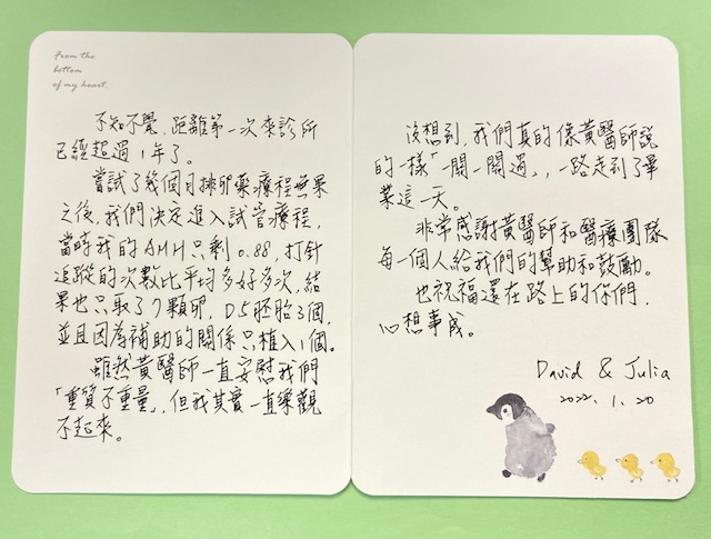 非常感謝黃醫師和醫療團隊每一個人給我們的幫助和鼓勵,也祝福還在路上的你們,心想事成。