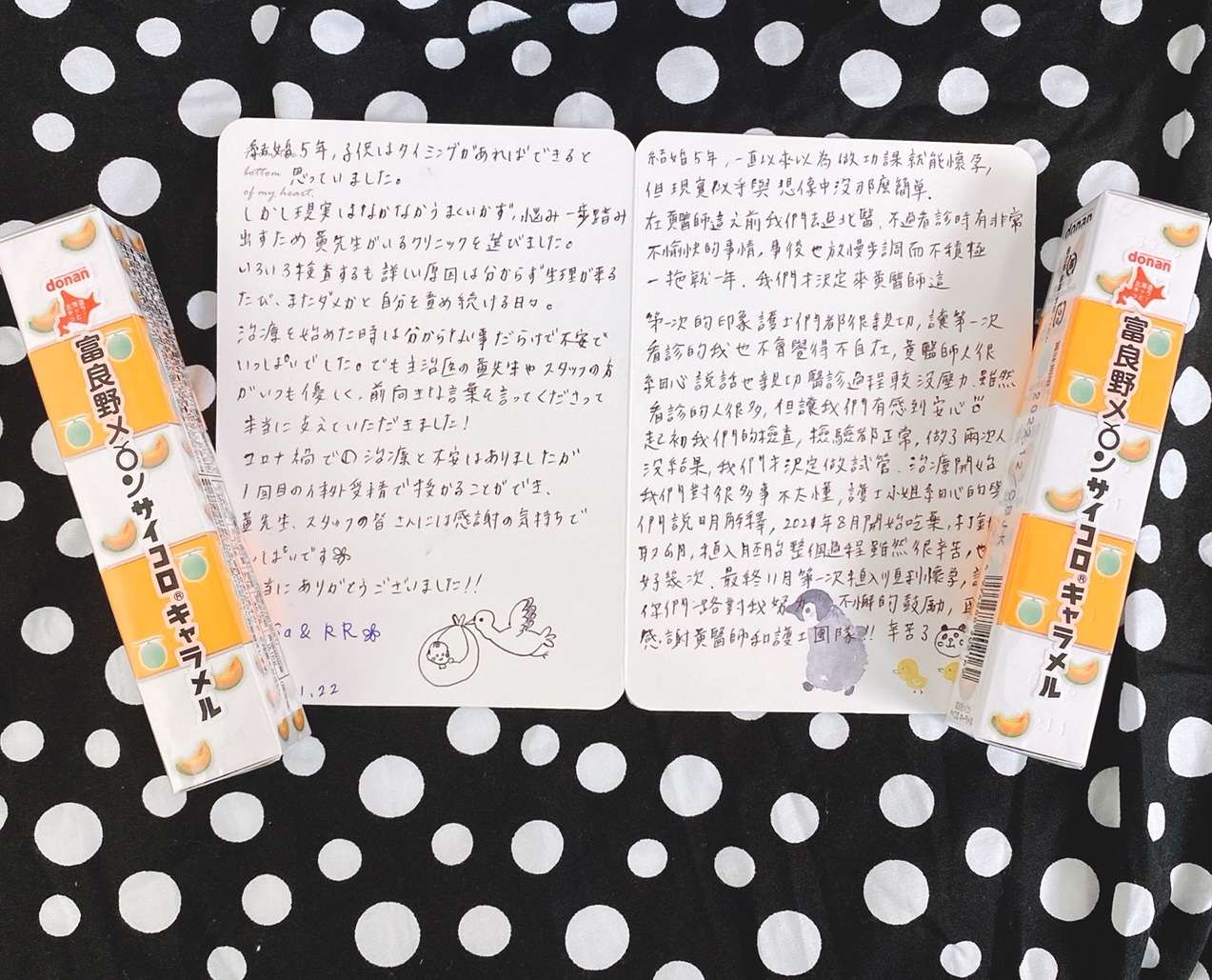 一開始先嘗試了兩次人工受孕,但不幸的沒有成功,稍做休息後他們積極的往試管療程邁進,打針用藥後她共取了14顆卵,但在取卵手術前她的黃體素及雌激素偏高,為了更好的成功率,我們採取了兩段式試管療程,很高興的在11月份的解凍胚胎的療程,她順利成功懷孕了。在她畢業這天,她特別準備從日本空運來的哈密瓜口味糖果來送給大家,恭喜他們,也祝她未來孕產期一切順利。