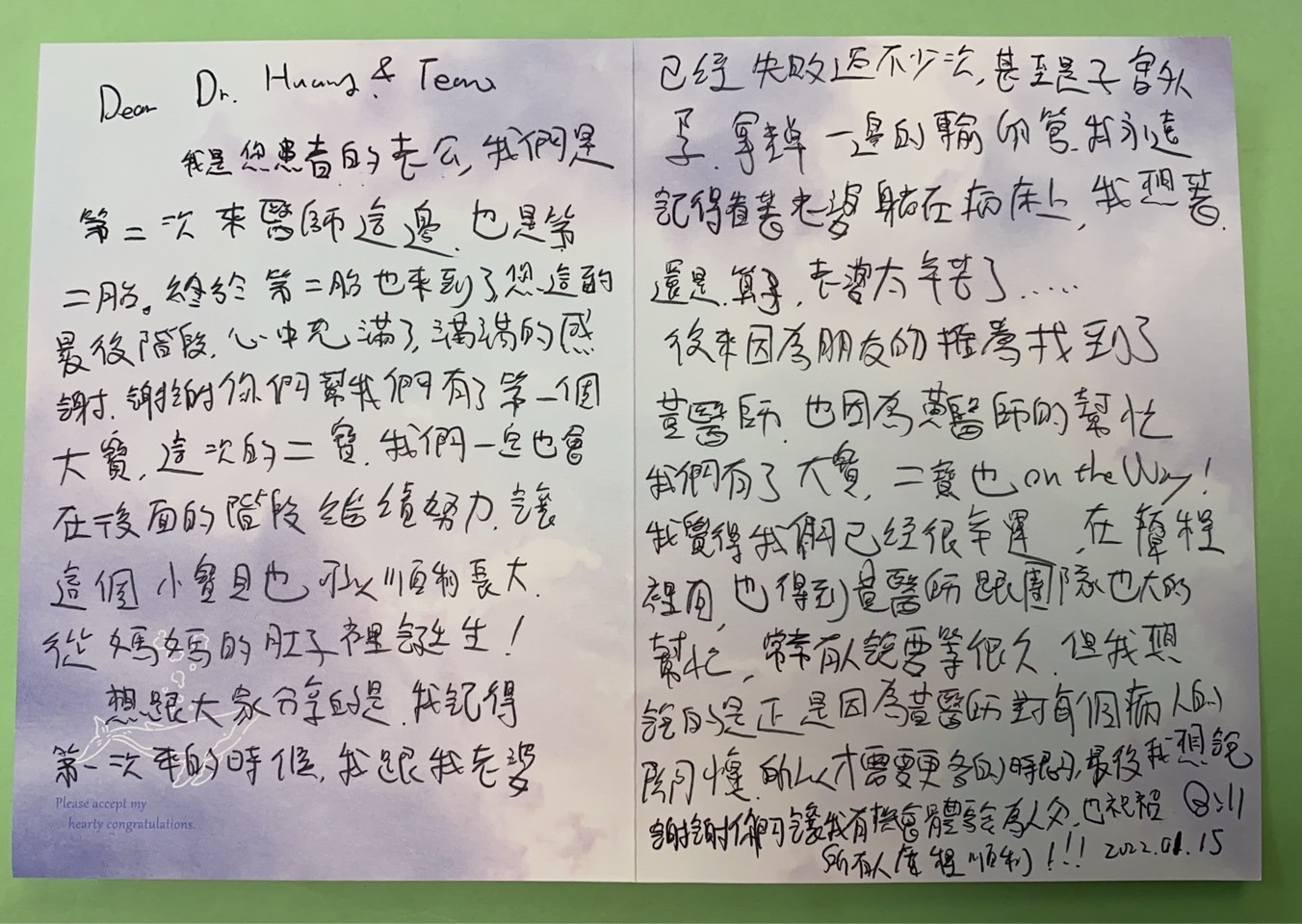 後來因為朋友的推薦找到的黃醫師,也因為黃醫師的幫忙我們有了大寶,二寶也on the way!我覺得我們已經很幸運,在療程裡面也得到黃醫師跟團隊也很大的幫忙,常常有人說要等很久,但我想說的是正是因為黃醫師對每個病人的關懷,所以才需要更多的時間,最後我想說謝謝你們讓我有機會體驗為人父,也祝福所有人療程順利!!!