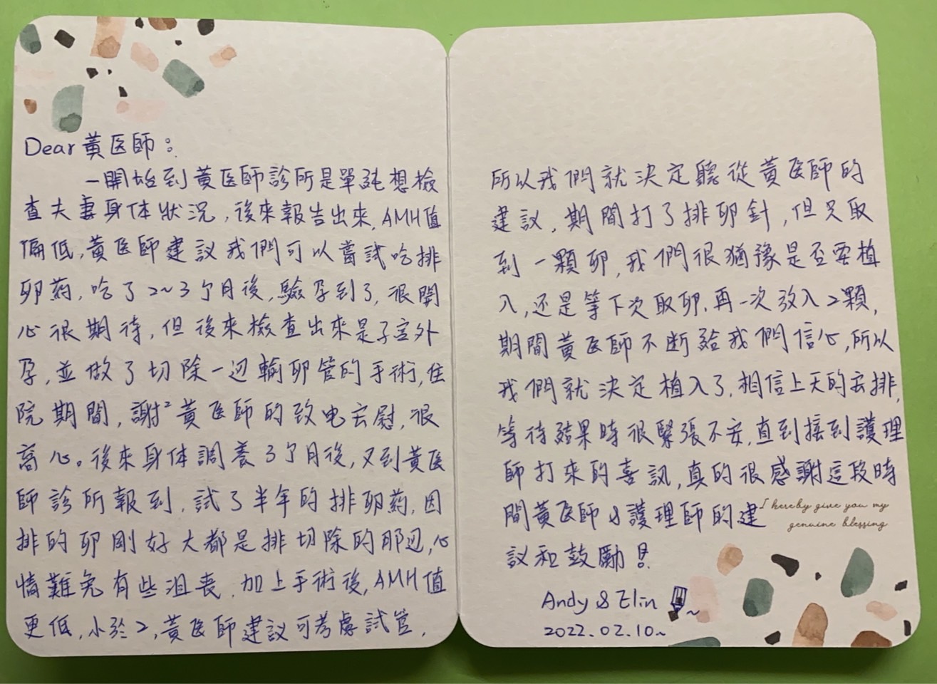 一開始到黃醫師診所是單純想檢查夫妻身體狀況,後來報告出來, AMH值偏低,黃醫師建議我們可以嘗試吃排卵藥,吃了2-3個月後,驗孕到了,很開心很期待,但後來檢查出來是子宮外孕,並做了切除一邊輸卵管的手術,住院期間,謝謝黃醫師的致電安慰,很窩心。