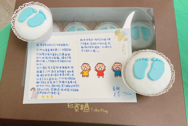 前幾天這位好朋友帶著他們滿周歲的寶寶來到我們診所,還送給我們ㄧ盒非常可愛美味的小腳印杯子蛋糕。寶寶頭好壯壯非常可愛,很高興能時隔兩年後看到他們ㄧ家。很感謝他們特地來到我們診所,祝福他們ㄧ家健康平安。