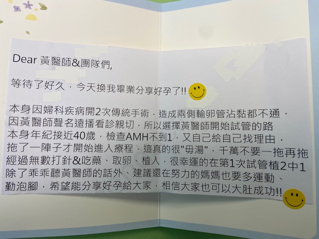 本身因婦科疾病開了2次傳統手術,造成兩側輸卵管沾黏不通,因黃醫師聲明遠播看診親切,所以選擇黃醫師開始試管的路,本身年紀皆盡40歲,檢查AMH不到1,又自己給自己找理由,拖了一陣子才開始進入療程,這真得很”母湯”,千萬不要一拖再拖。經過無數打針&吃藥、取卵、植入,很幸運的在第一次試管植2中一,除了乖乖聽黃醫師的話外、建議還在努力的媽媽也要多運動,勤泡腳,希望能分享好孕給大家,相信大家也可以大肚成功!