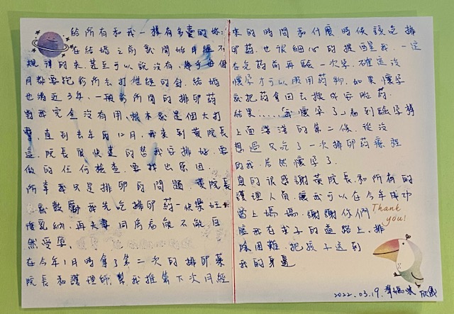 所幸我只是排卵的問題,黃院長就鼓勵我先吃排卵藥,快樂妊、復乳納再夫妻同房看能不能自然受孕。再今年1月時拿了第二次的排卵藥,院長和護理師幫我推算下次月經來的時間和什麼時候吃排卵藥,也很細心提醒我一定在吃排卵藥前在驗一次孕,如果懷孕就把藥拿回去換成安胎藥。