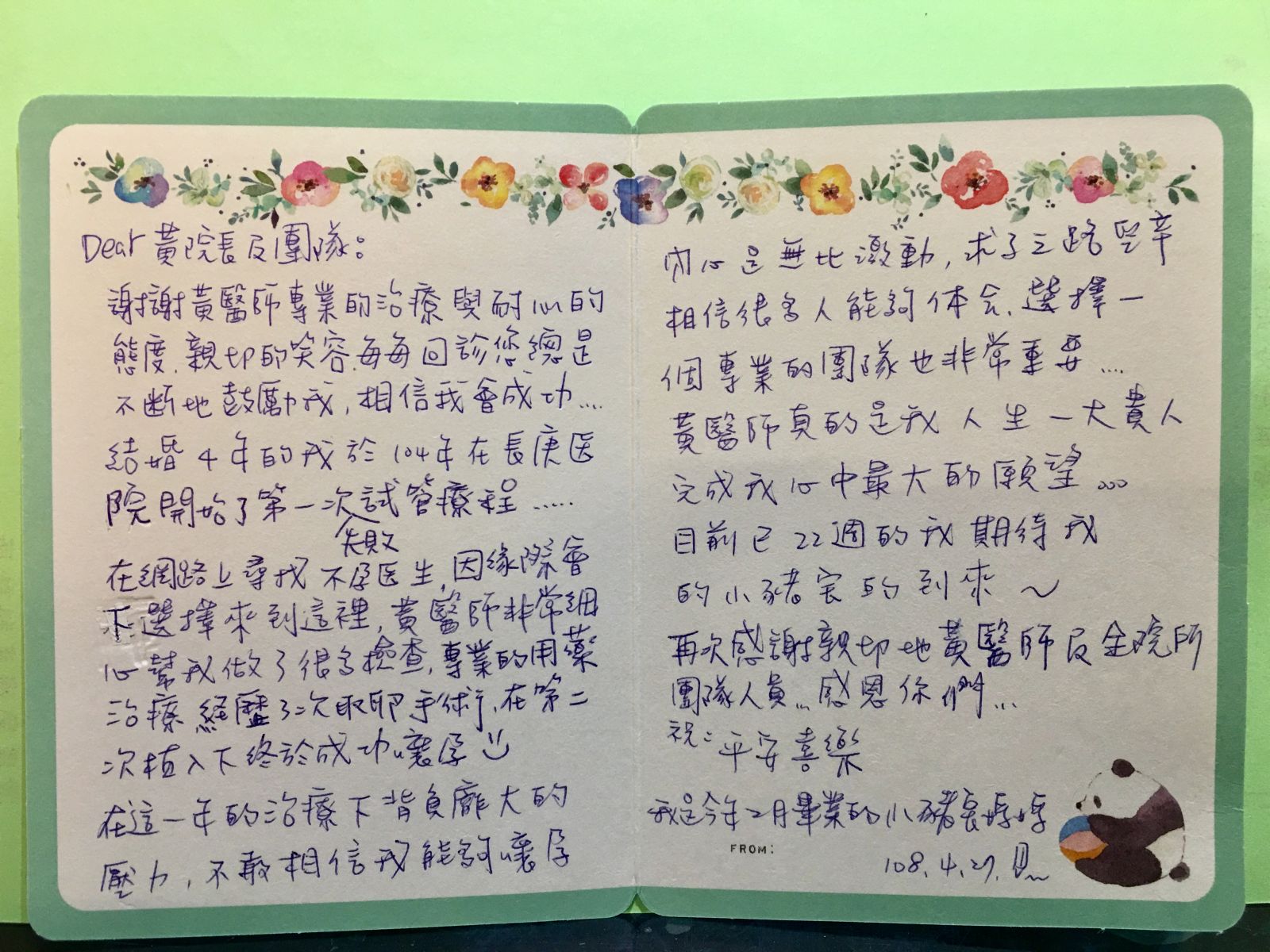 結婚四年的我於104年在長庚醫院開始了第一次失敗試管療程….在網路上尋找不孕症醫生,因緣際會下選擇來到這裡,黃醫師非常細心幫我做了很多檢查,專業的用藥治療,經歷三次取卵手術,在第二次植入下中於成功懷孕。