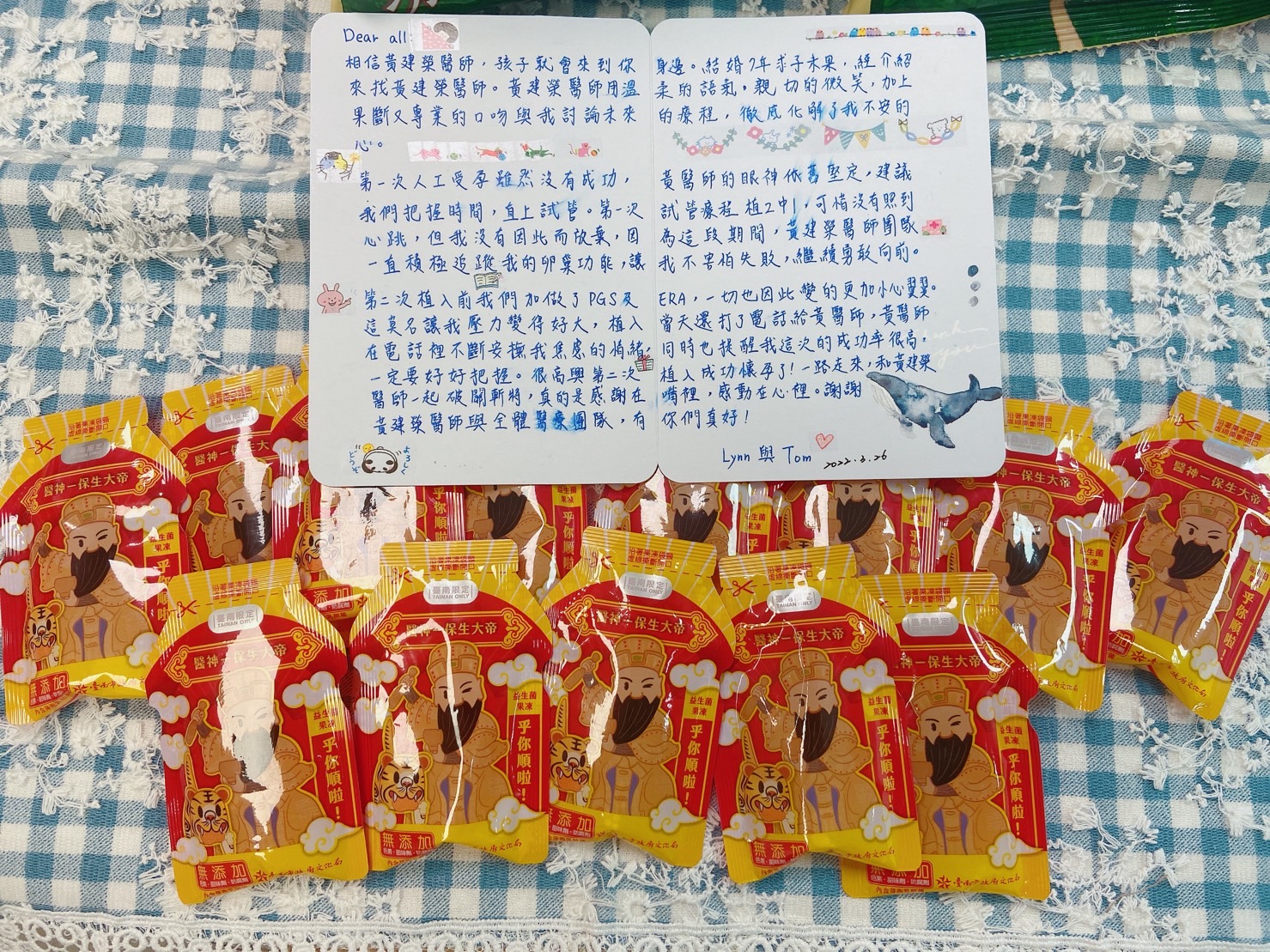 很高興第二次植人成功懷孕了!一路走来,和黃建榮醫師一起破關斬將,真的是感謝在嘴裡,感動在心裡。謝謝黃建榮醫師與全體醫療團隊,有你們真好!