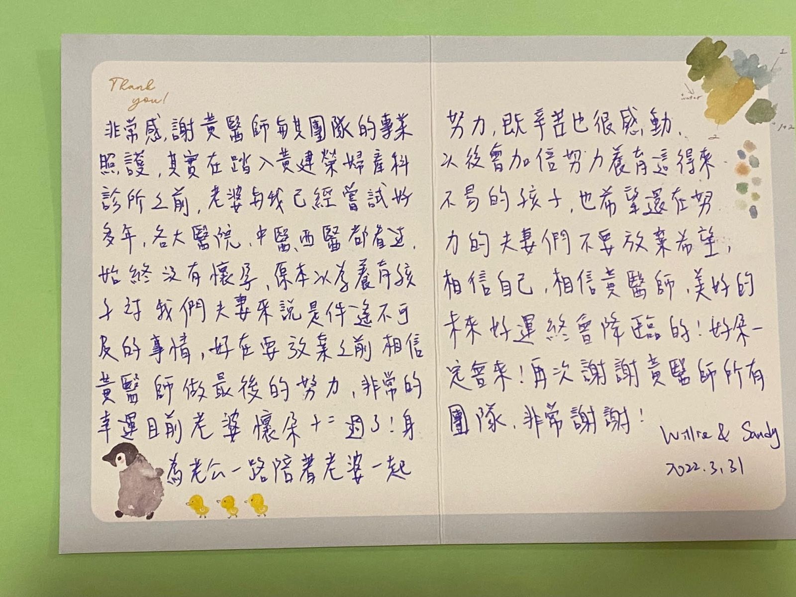 身為老公一路陪著老婆一起努力,既辛苦也很感動,以後會加倍努力養育這得來不易的孩子,也希望還在努力的夫妻們不要放棄希望,相信自己,相信黃醫師,美好的未來好運終會降臨的!